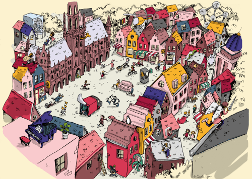 As unusual as they may look, at least six of the characters in this drawing are actual staple statues from my beloved hometown.